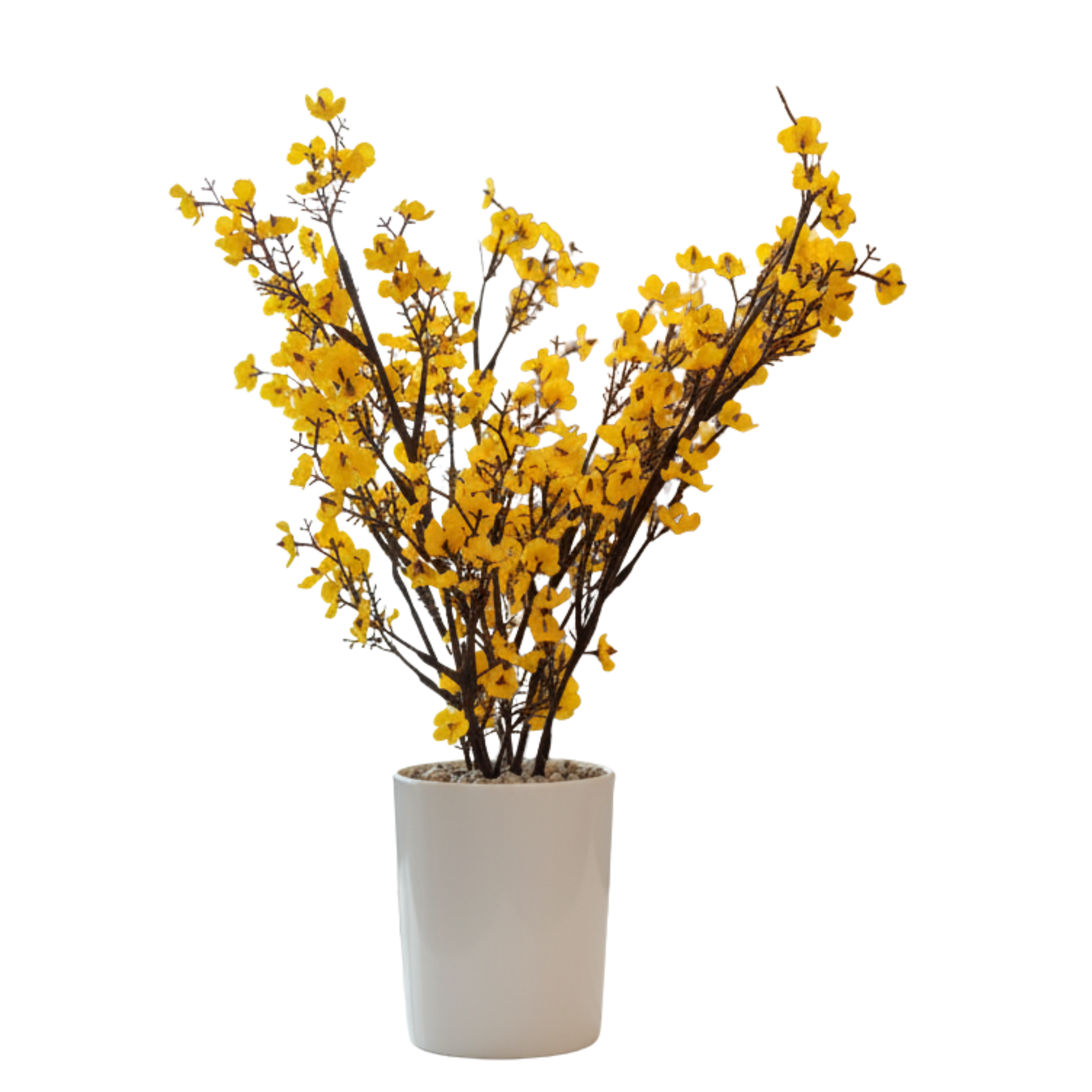 This exquisite botanical sculpture features an abundant spray of hyper-realistic faux forsythia branches, laden with countless, delicate golden-yellow blossoms. Each tiny bloom is meticulously crafted to capture the joyous burst of spring, creating a radiant cascade of color that is both invigorating and refined. This perpetual floral display offers the vibrant beauty of nature with the ultimate luxury of zero maintenance, ensuring an enduring aesthetic that always looks pristine.