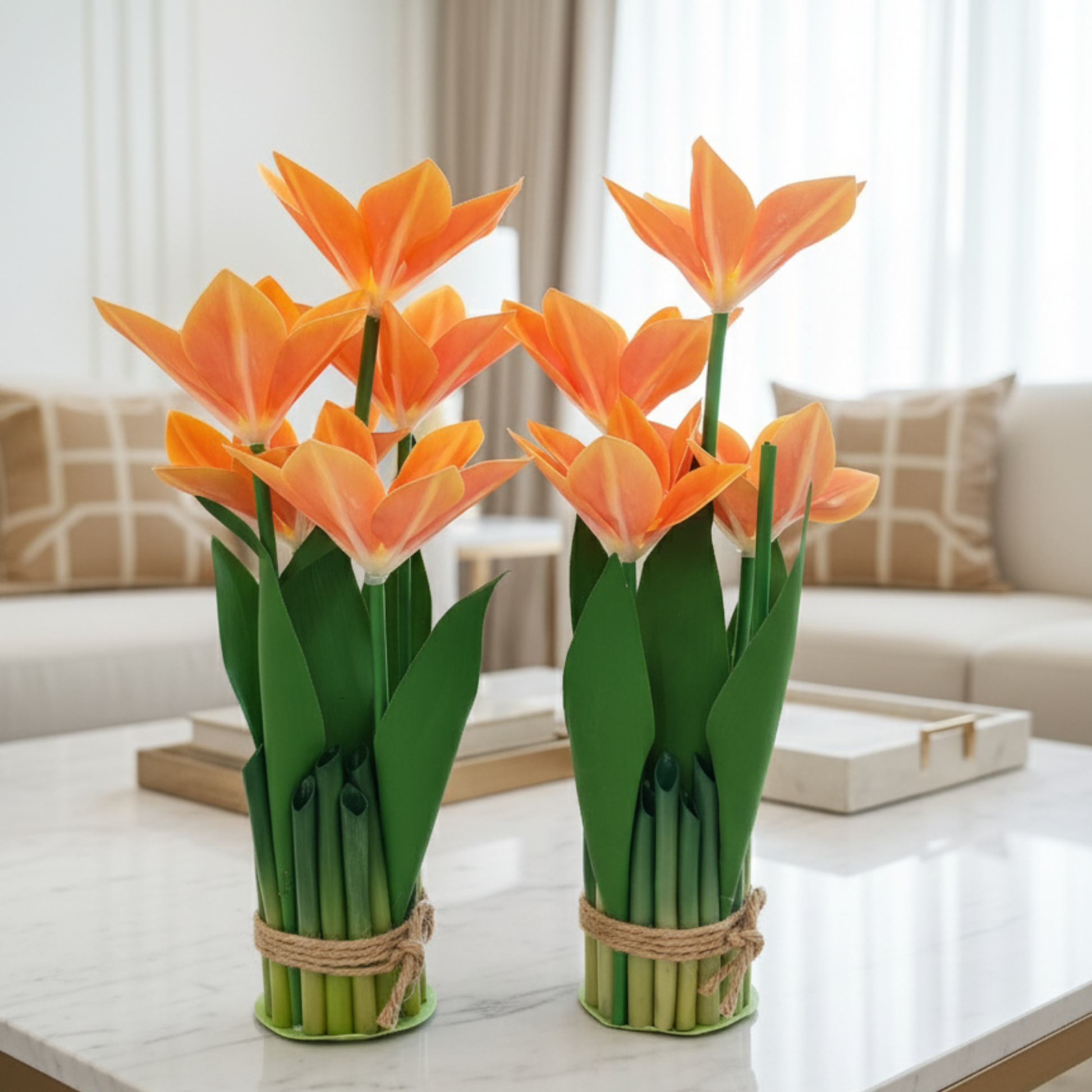 This set of two exquisite Artisan Tulip Arrangements transcends typical faux florals, presenting a piece of sustainable luxury for the discerning decorator. Each vibrant, sun-drenched orange tulip is meticulously handcrafted from premium silk or high-grade textile, capturing the ephemeral beauty of a fully bloomed flower with unrivaled realism.