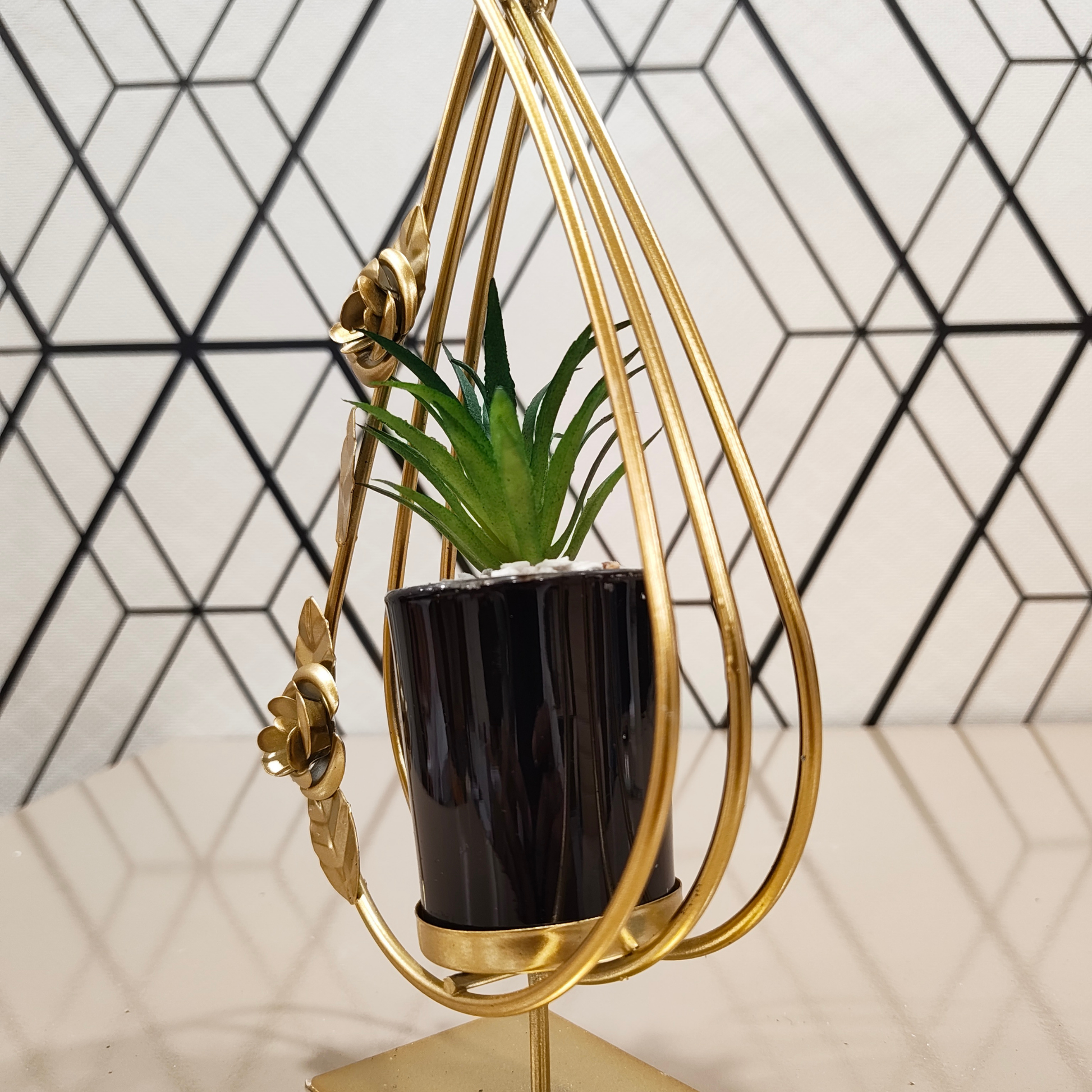 Suspended within this golden embrace is a sleek, modernist onyx-black ceramic vessel, housing a vibrant, hyper-realistic faux succulent. Its spiky, lush green leaves provide a striking contrast to the deep black pot and the radiant gold frame. This perpetual botanical offers the refreshing beauty of nature with the ultimate luxury of zero maintenance, ensuring an enduring aesthetic that always looks pristine.