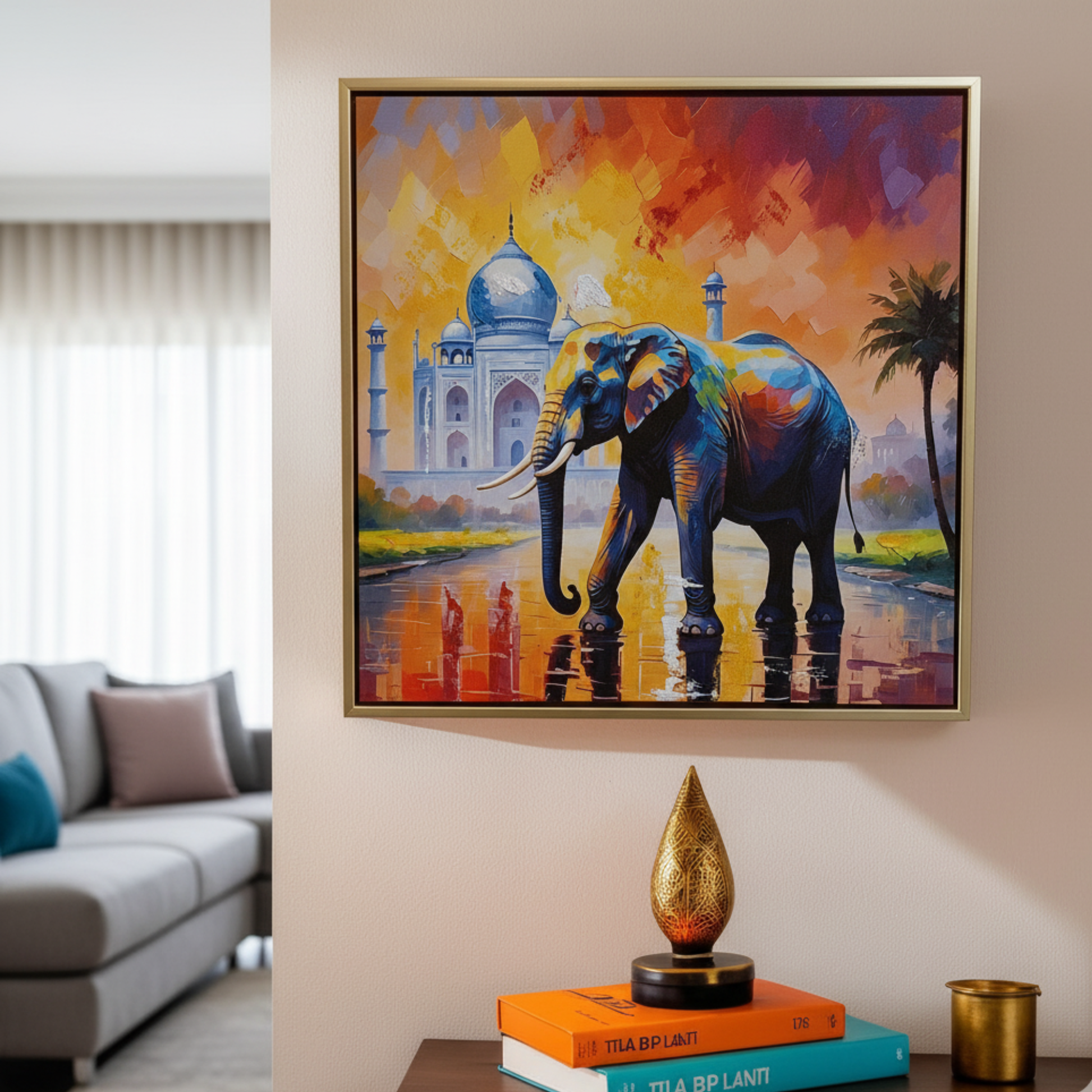 Capture the spirit of imperial grandeur and vibrant artistry with "Mughal Twilight." This premium, gallery-wrapped canvas art is a luxurious fusion of history, wildlife, and contemporary color work, designed to be an unforgettable statement piece.