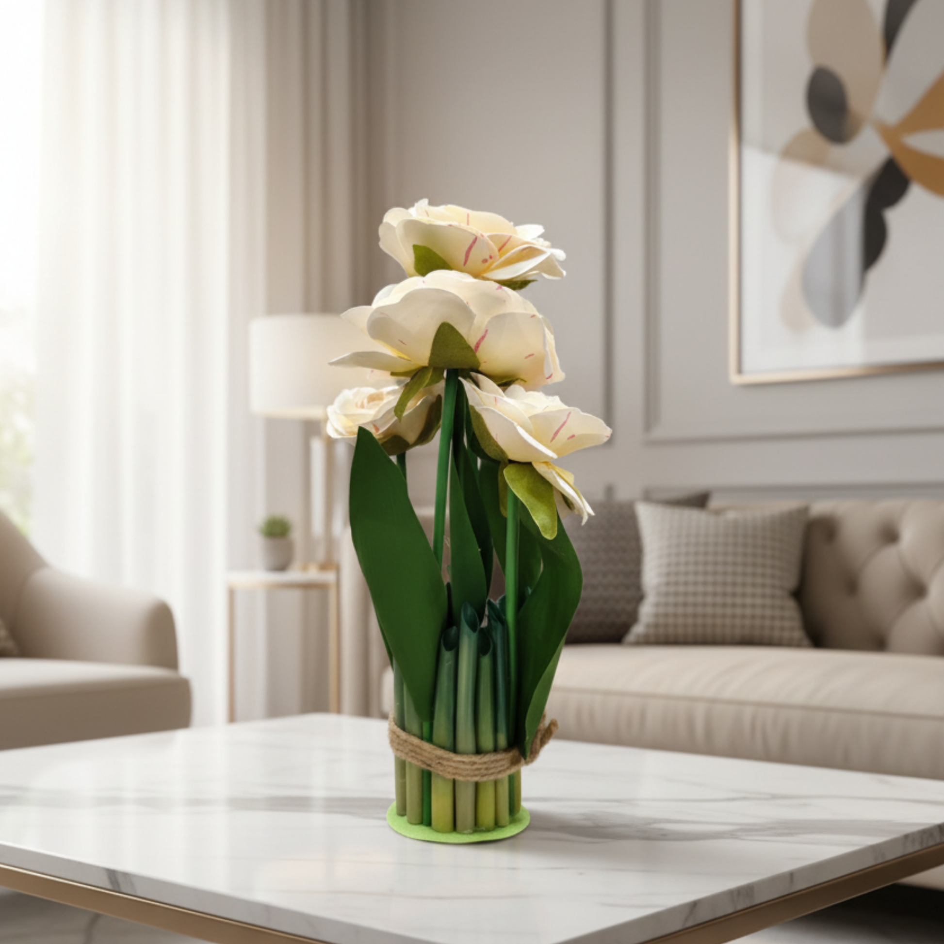 Each arrangement features multiple full flower heads and realistic green foliage. The "vases" are crafted from a unique, naturalistic bundle of green decorative sticks or stalks, secured with a piece of natural jute twine. This rustic design gives the illusion of fresh-cut flowers simply gathered and tied.