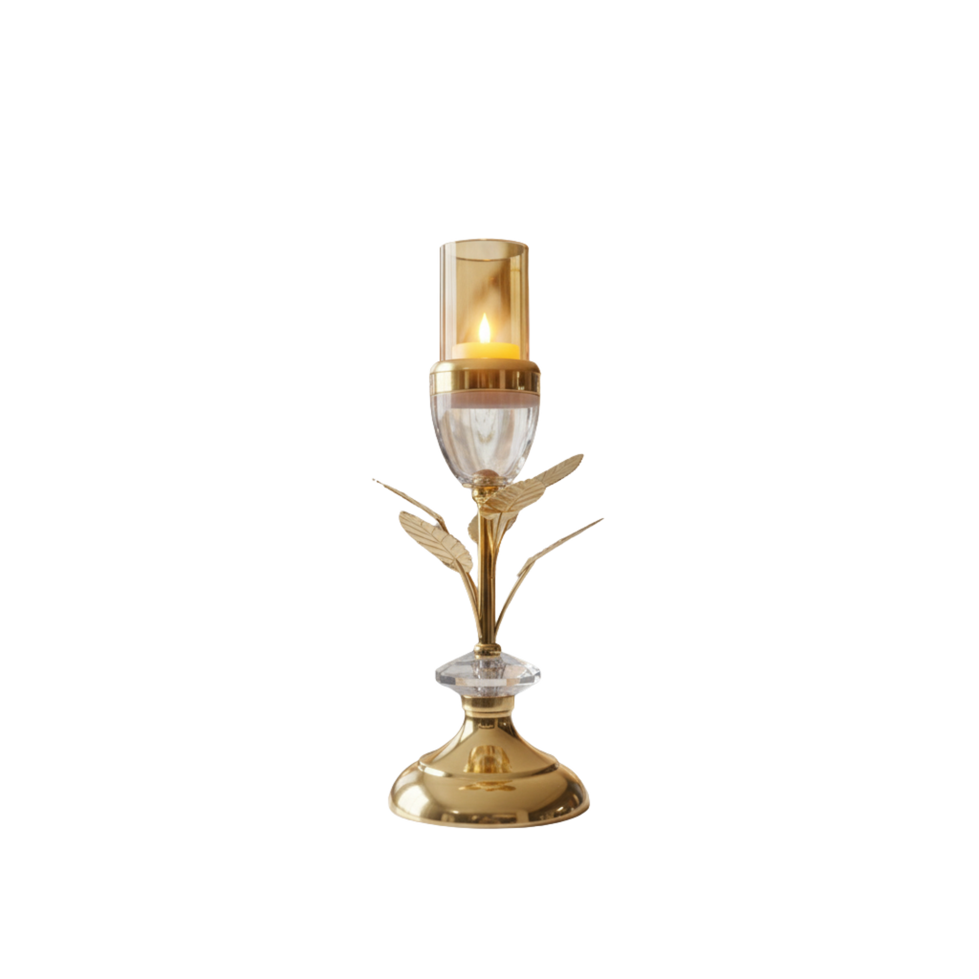 lluminate your space with the unique elegance of the "Ember Bloom" Candle Holder. This stunning set features three distinct sizes, each a harmonious blend of rustic charm and polished luxury. The solid wood base, with its natural grain, provides a warm, organic foundation, while the polished golden chalice and glass hurricane top add a touch of opulent glamour.